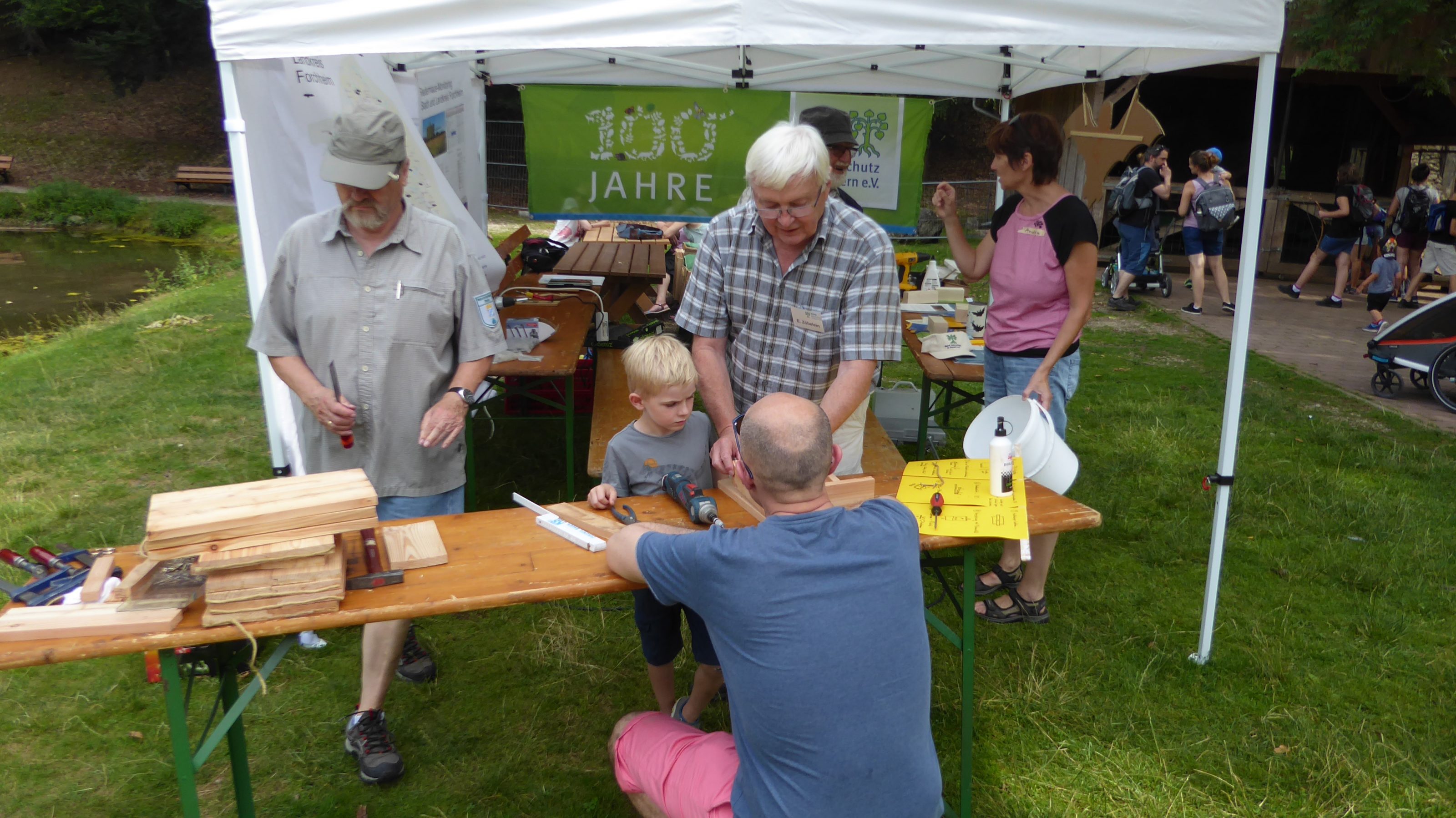 Am 20. Juli war die Forchheimer Kreisgruppe des BUND Naturschutz als Aktiv-Gast im Wildpark. An drei Pavillionstationen konnten kleine und große Besucher ihr Talent im Bauen von Rindenschiffchen, Saatgutkugeln und Wildbienen-Nisthilfen probieren. Highlight waren selbst zu schraubende und mit Namen beschriftete Fledermauskästen, die im Wildpark aufgehängt werden und deren Bezug durch die nachtaktiven Insektenjäger in den kommenden Jahren dokumentiert wird. Jungforscher konnten die Wasserqualität des Wildpark-Bachs untersuchen und ihr Wissen zu Wildbienen, Schmetterlingen und Waldtieren vertiefen.